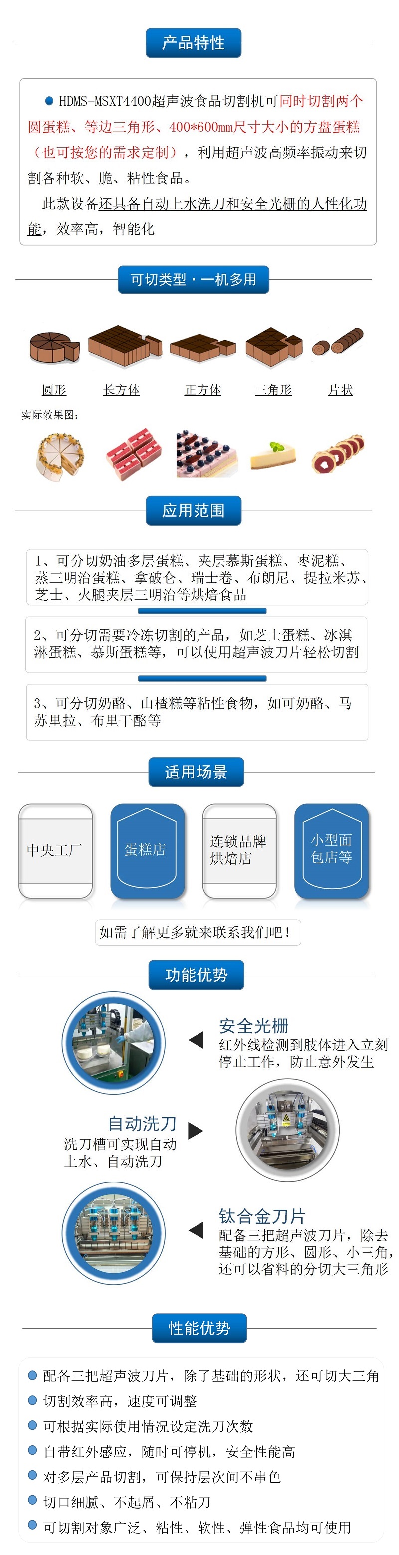 該設(shè)備配備雙把超聲波刀片,既可切方蛋糕,也可同時切兩個圓蛋糕,效率更高