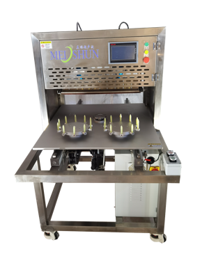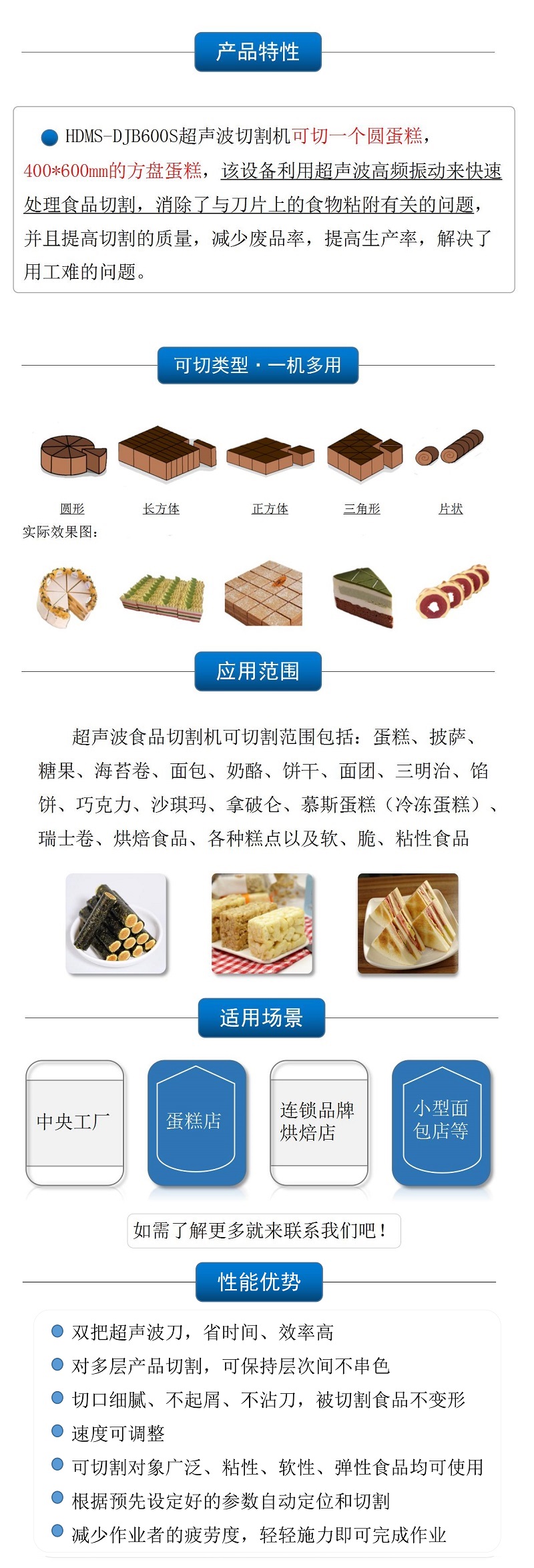 該設(shè)備配備單把超聲波刀片,可切圓形(只限一個(gè)圓蛋糕),也可切方形 |